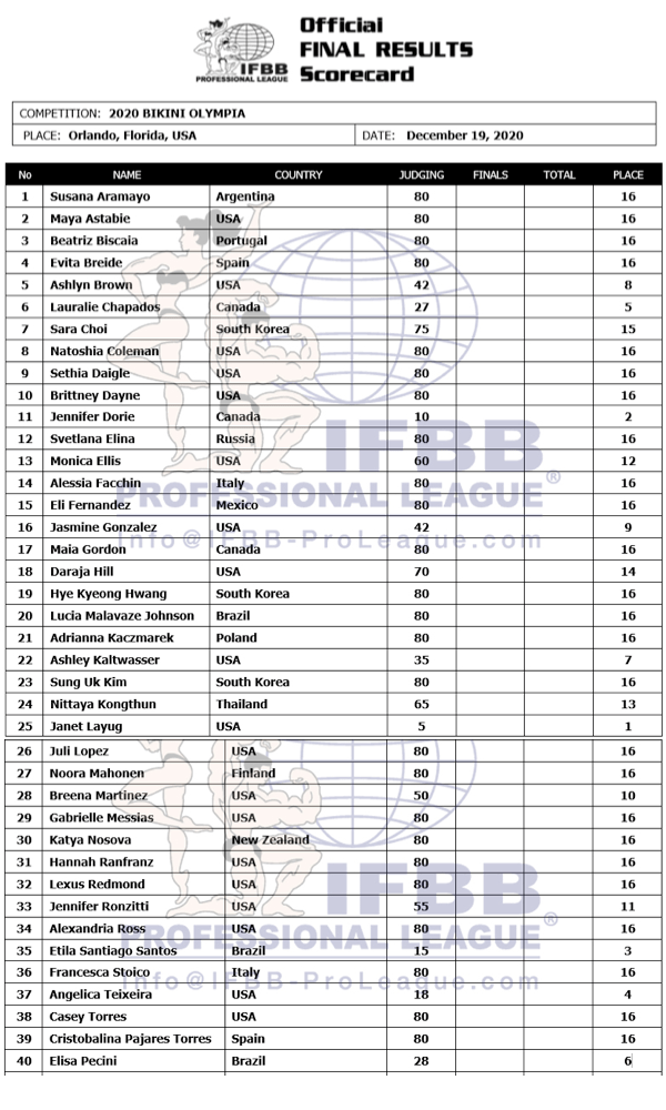 Bei großen Bewerben werden oft auch nicht alle AthletInnen platziert. Als Beispiel siehst du unten die Score Card der Bikini Olympia 2020, wo nur bis zu Platz 15 gewertet wurde. Alle anderen Athletinnen stehen automatisch auf dem 16.Platz