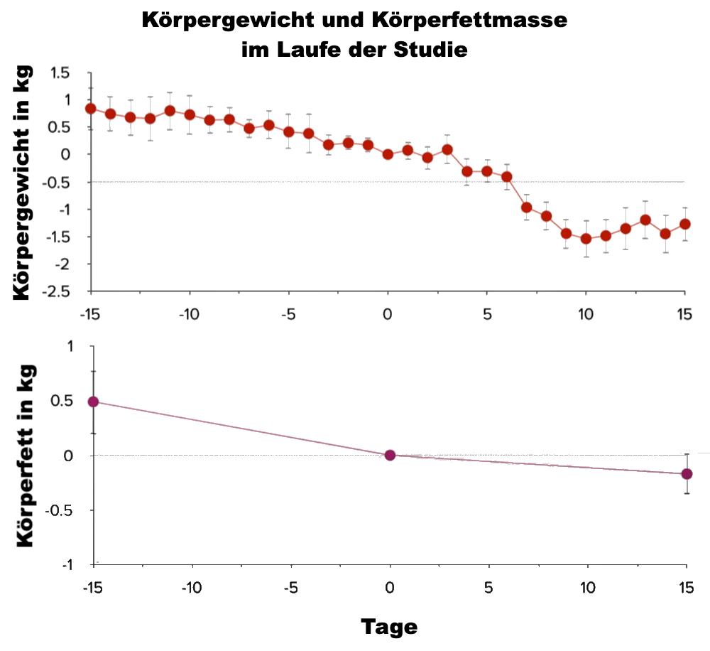 Während das Gewicht dramatisch sank, verlangsamte sich der Abbau von Körperfett um mehr als die Hälfte. Der Gewichtsverlust resultierte fast ausschließlich aus Wasserverlust und zusätzlich aus dem Verlust von Körpereigenem Protein – der Körper verbrannte seine eigene Muskelmasse zur Gewinnung von Energie.