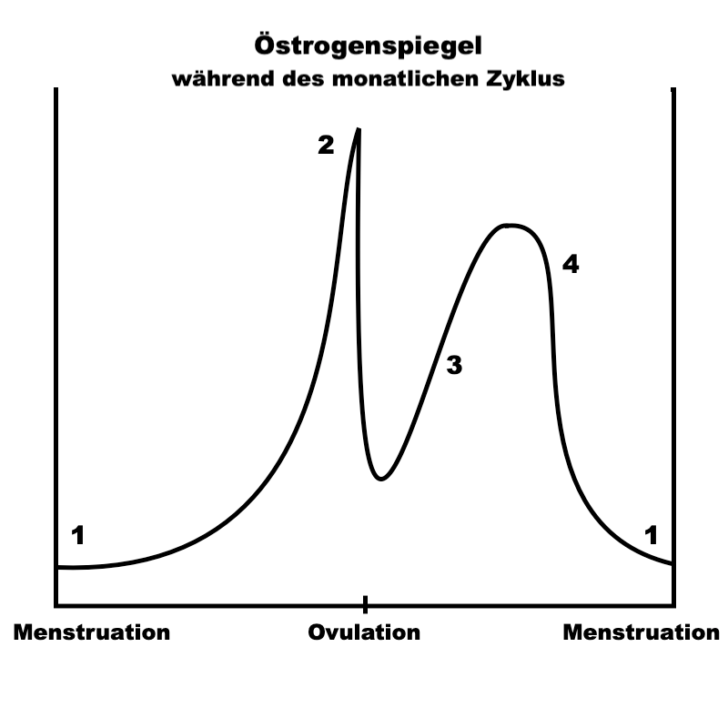 (1) Zu Beginn des Zyklus – das ist der Zeitpunkt, wenn die monatliche Blutung anfängt – befindet sich eher wenig Östrogen im Blutkreislauf.